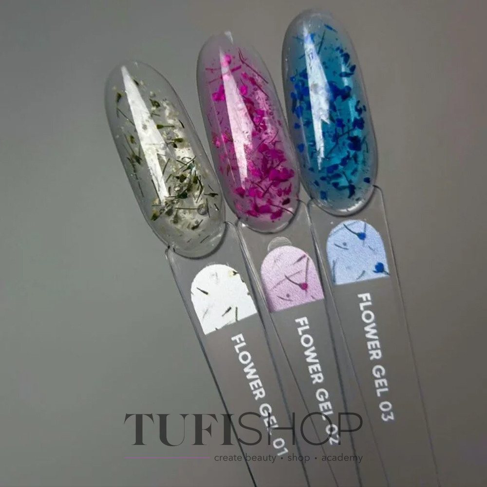 NAILSOFTHEDAY Flower Gel ist die erste Kollektion von Aufbaugelen mit Trockenblumen. Kann auch zur Stärkung der unteren Formen verwendet werden. Das Blütengel hat eine mittlere Dicke und verteilt sich von selbst. Wenn das Gel polymerisiert ist, verursacht es kein Brennen. Die in der Zusammensetzung enthaltenen Trockenblumen verändern ihren Farbton nicht und lassen sich leicht auf der Nageloberfläche verteilen. Es ist nicht nötig, Sägemehl herzustellen. Das fertige Ergebnis sieht sehr weich und luftig aus.