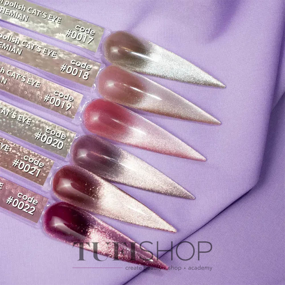 DNKa's Color Gel Polish Bohemian Cat's Eye collection is a series of 12 unique shades infused with elegance and inspired by the cat eye effect. These exceptional magnetic hybrid lacquers allow you to create stunning designs with subtle crystalline shine and depth that change depending on the light and angle of view, reminiscent of the beauty of gemstones.