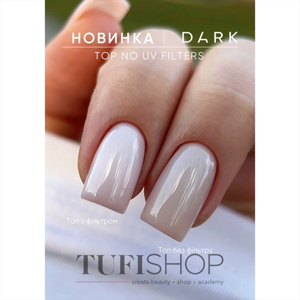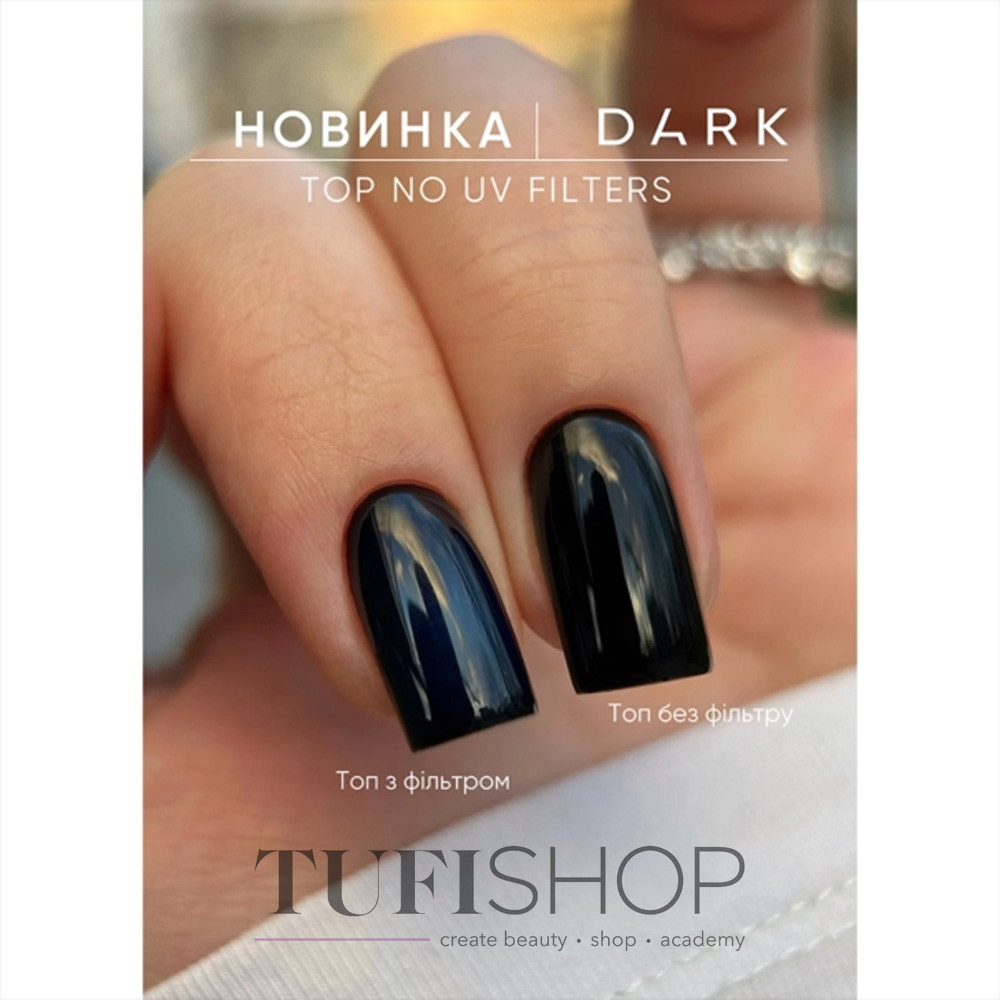 DARK Top No UV Filters is a gel polish top without a sticky layer from a famous brand. Top without UV filters keeps the gloss without changing the shade (does not yellow, does not darken from the sun, suede) on light colors up to 4 weeks! The top is easy to work with, does not spread and evenly lies on the nail plate. It has a medium consistency. Apply a thin layer on top of the applied gel polish or camouflage base.