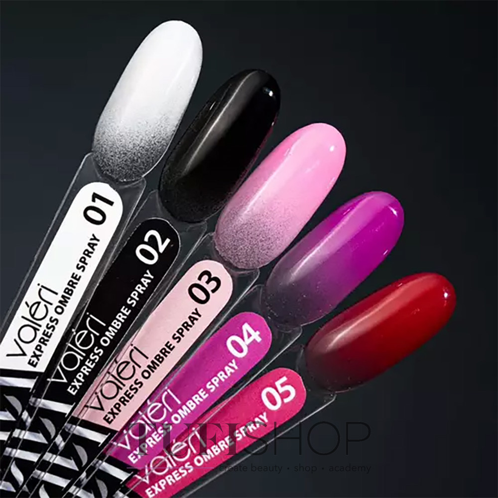 REJECT Configure ACCEPT ALLDreaming of creating the perfect ombré without extra effort? Introducing the Express Ombre Spray by Valeri — a spray that creates a gradient coating in just seconds! Classic shades 1–5 offer soft transitions for lovers of elegant classics. It's the perfect choice for creating smooth and sophisticated ombré designs. Flash shades 6–15 are vibrant and dynamic colors! Add sparkle to your nails that shine under the light. A perfect solution for festive looks or evening outings. Whether you prefer refined classics or a dazzling effect, the Express Ombre Spray simplifies the technician’s work and delights clients with stunning results!