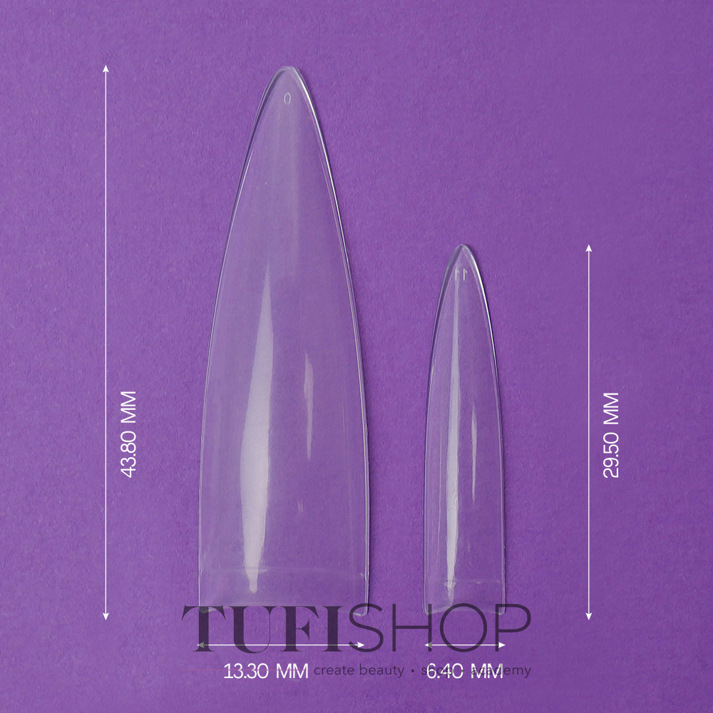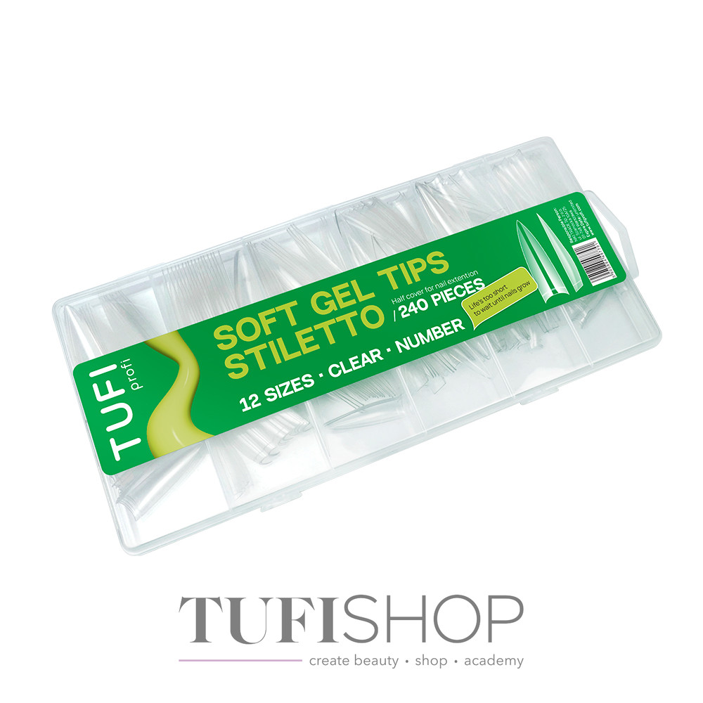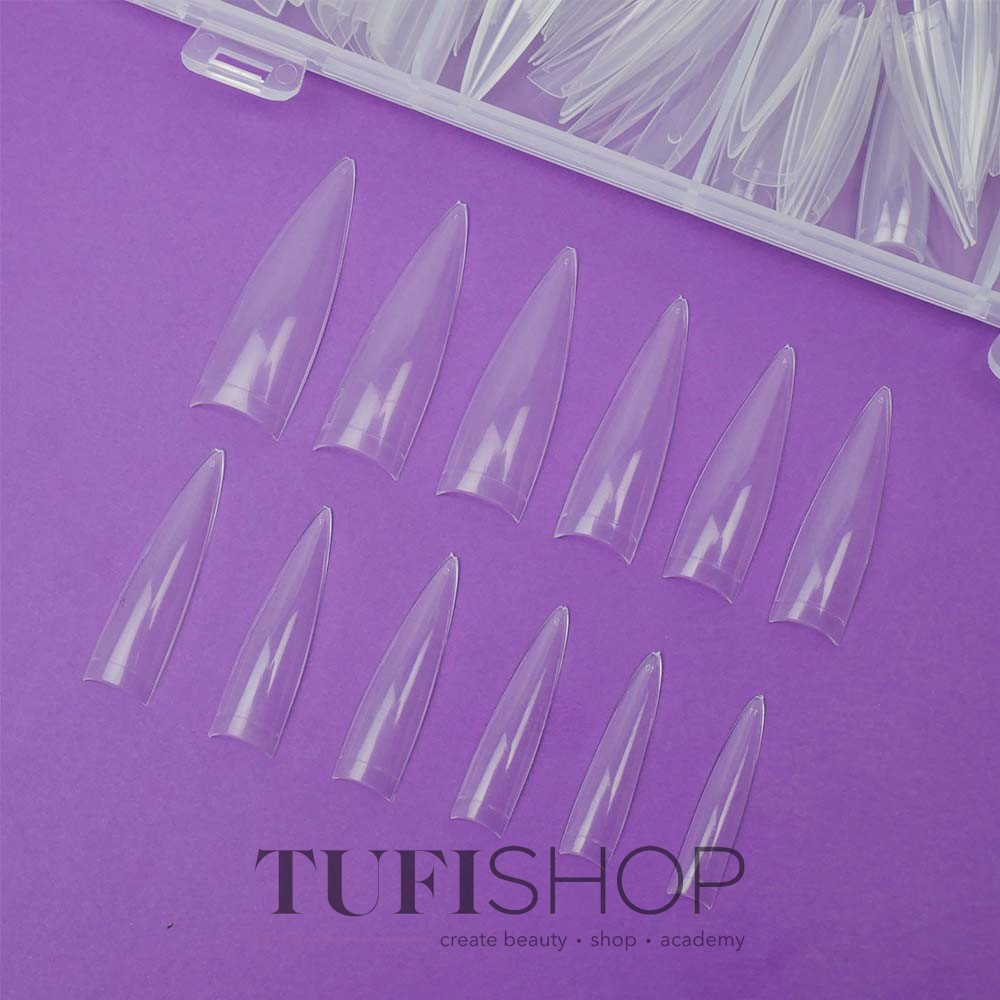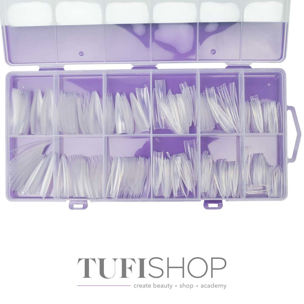 The set includes 240 transparent tips in 12 sizes (0–11), allowing a perfect fit for any nail type. They can be removed by filing or soaking. Compatible with all LED/UV lamps and gel bases. Available in three main shapes: ballerina, stiletto, and square.