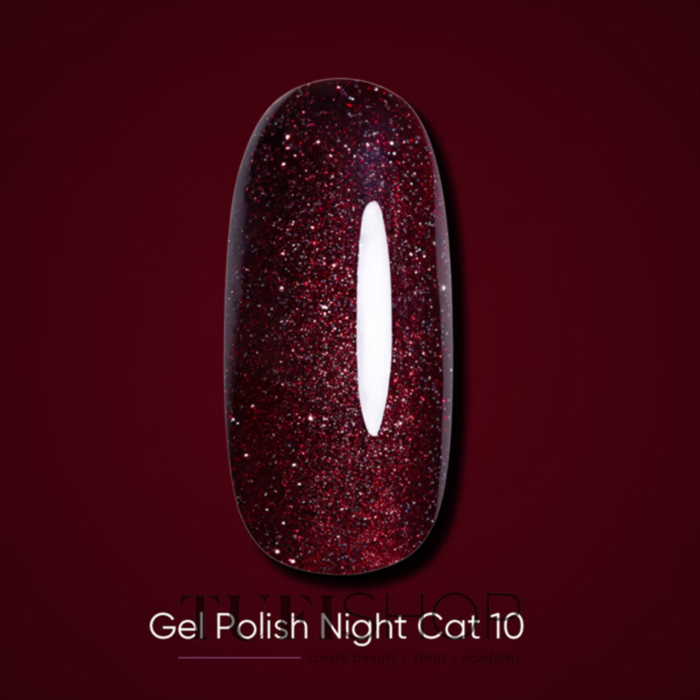 DARK Gel Polish Night Cat is a new collection of reflective gel polishes with a cat eye effect. The base contains metallized powder. Due to its presence in the composition and the influence of a magnetic field, shimmer particles spread and create shimmering shimmers that shine like precious stones under natural and artificial light sources. The unique feature of the shimmering shades of the palette lies in the structure of the gel-lacquer, which gives the coating a crystal effect.