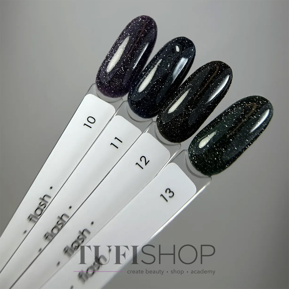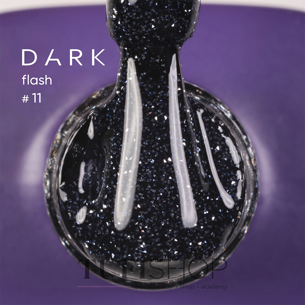 Reflective Gel Polish Dark Gel Polish Flash — a professional gel polish with a “shining lights” effect. Thanks to the finest reflective particles, it sparkles brightly under camera flash and artificial light, creating an impressive shimmering effect with a subtle pearly veil.