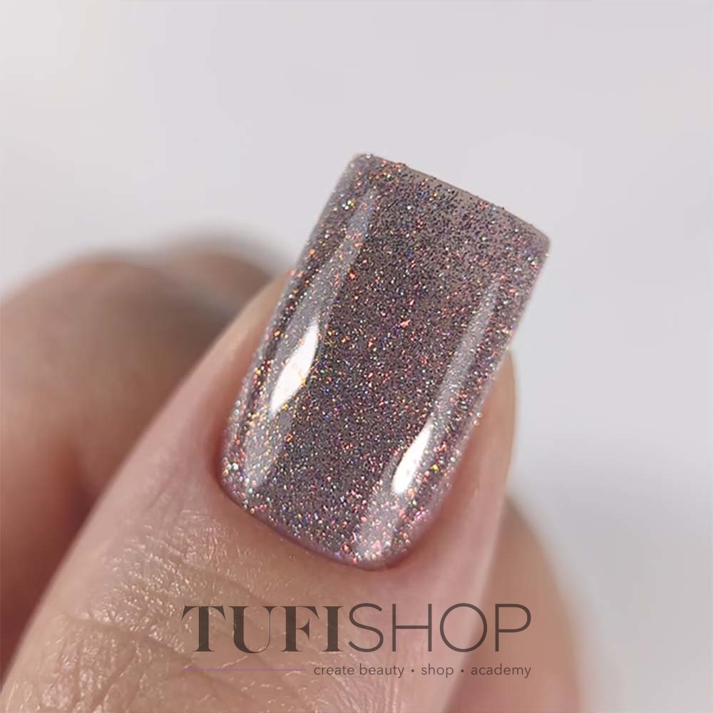Reflective Gel Polish Dark Gel Polish Flash — a professional gel polish with a “shining lights” effect. Thanks to the finest reflective particles, it sparkles brightly under camera flash and artificial light, creating an impressive shimmering effect with a subtle pearly veil.