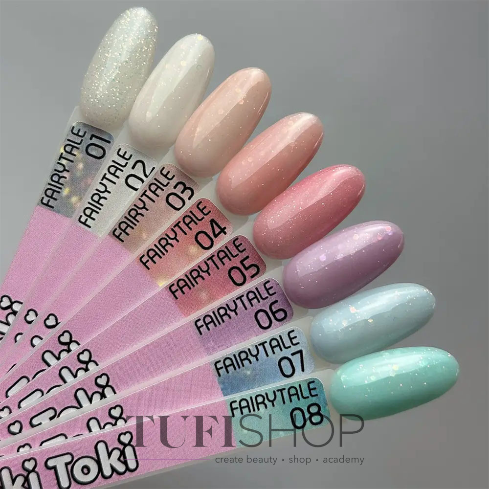 Toki Toki is a kawaii in the world of gel polishes: both cute and very trendy. A huge number of colors, different collections, small volume, affordable price, excellent quality, cute packaging - all this falls in love! Toki-Toki gel polishes are made of the best materials, which ensures the quality of the product. Gel polish meets all the characteristics of quality gel lacquers: the consistency is thick, does not spread, perfectly lies on the nail plate and has a pleasant fruity smell. With a wide palette of colors, which represents the nail brand, you can give flight of fancy, and create a beautiful, rich manicure, both in the salon professional, and at home. The initial shine pleases for a long time, and the coating will not fail in the long wear of the manicure. Toki-Toki Fairytale gel polish collection is a delicate and romantic colors filled with shine and shimmer. Thanks to the colors of the collection you can easily emphasize your personality.