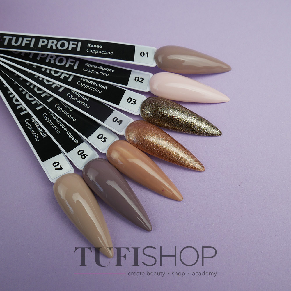 TUFI profi PREMIUM präsentiert eine neue Palette von Cappuccino-Gellacken. Eine praktische Flasche und ein hochwertiger Pinsel garantieren eine gleichmäßige Verteilung des Lacks auf der gesamten Nagelplatte, ohne Auslaufen oder Brüchen. TUFI Profi-Gellack Hat eine dauerhafte Beschichtung, reißt nicht und sorgt für eine einfache und angenehme Anwendung.