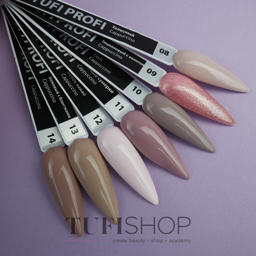 TUFI profi PREMIUM präsentiert eine neue Palette von Cappuccino-Gellacken. Eine praktische Flasche und ein hochwertiger Pinsel garantieren eine gleichmäßige Verteilung des Lacks auf der gesamten Nagelplatte, ohne Auslaufen oder Brüchen. TUFI Profi-Gellack Hat eine dauerhafte Beschichtung, reißt nicht und sorgt für eine einfache und angenehme Anwendung.