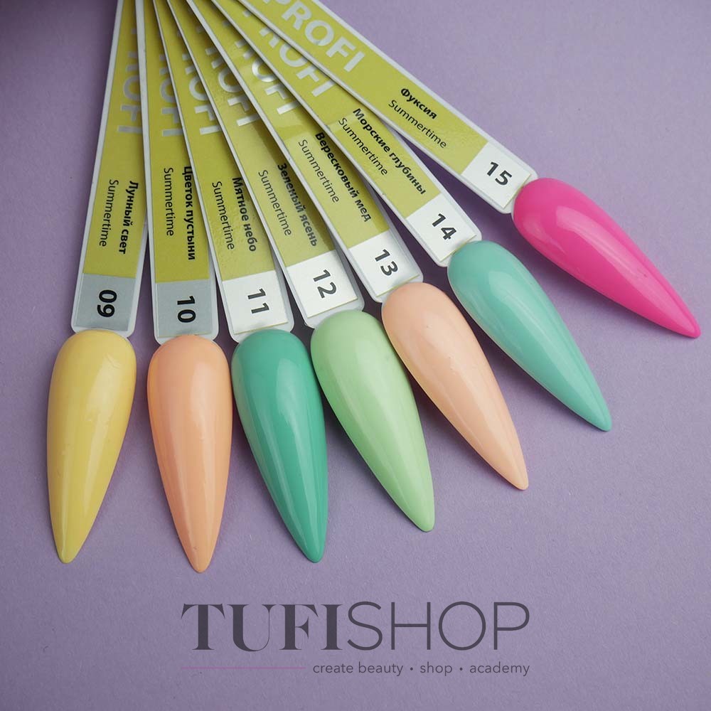 TUFI profi PREMIUM Sommerzeit ist eine saisonale Palette bestehend aus 15 Farbtönen Lacke gelartig , frisch wie der Frühling und saftig wie der Sommer. Bei der Entwicklung der Palette haben wir uns an Trends der Modebranche orientiert, weshalb sich die Farbtöne auf die Frühjahr-Sommer-Kollektionen des Pantone-Instituts beziehen. Unsere Farbtöne – Orange „Ringelblume“, saftig „Flamme“, „Mondlicht“, „Heidehonig“ – betonen die Bräune perfekt. „Mint Sky“ und „Sea Depths“ erinnern Sie daran, sich auszuruhen, abzukühlen und zu entspannen.