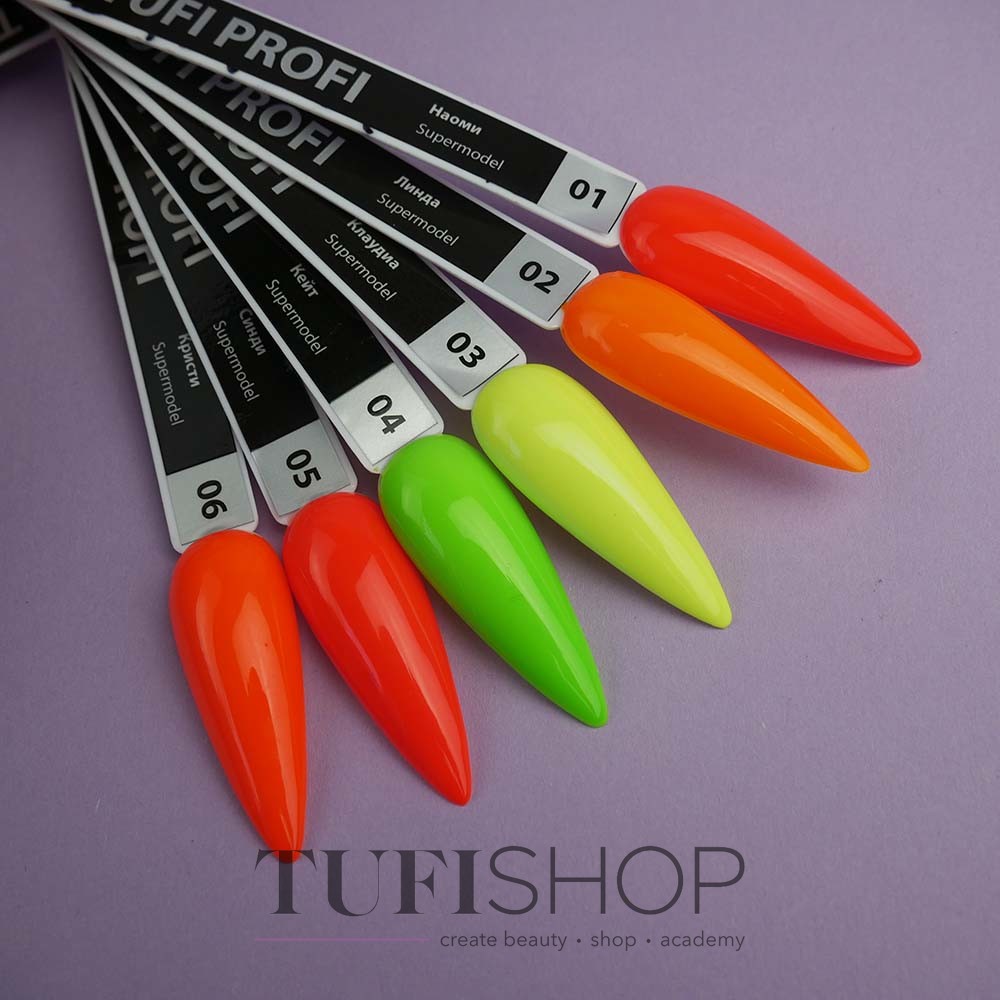 TUFI profi PREMIUM Supermodel ist eine Serie modischer Neon-Gellacke. Entworfen für aufgeweckte Mädchen, die wissen, wie es geht und es lieben, aufzufallen. TUFI Profi-Technologien wurden von den Supermodels der 90er Jahre inspiriert: Naomi Campbell, Linda Evangelista, Claudia Schiffer und anderen echten, leuchtenden, süßen Ikonen der 90er Jahre. Neon-Gellacke eignen sich perfekt für die fantastischsten Nageldesigns. Wenn Sie in diesem Leben bereit sind, alle Höhen zu erobern, machen Sie eine strahlende Maniküre und drücken Sie Ihre Essenz aus! Besonders eindrucksvoll wirkt die Kollektion im matten Finish.