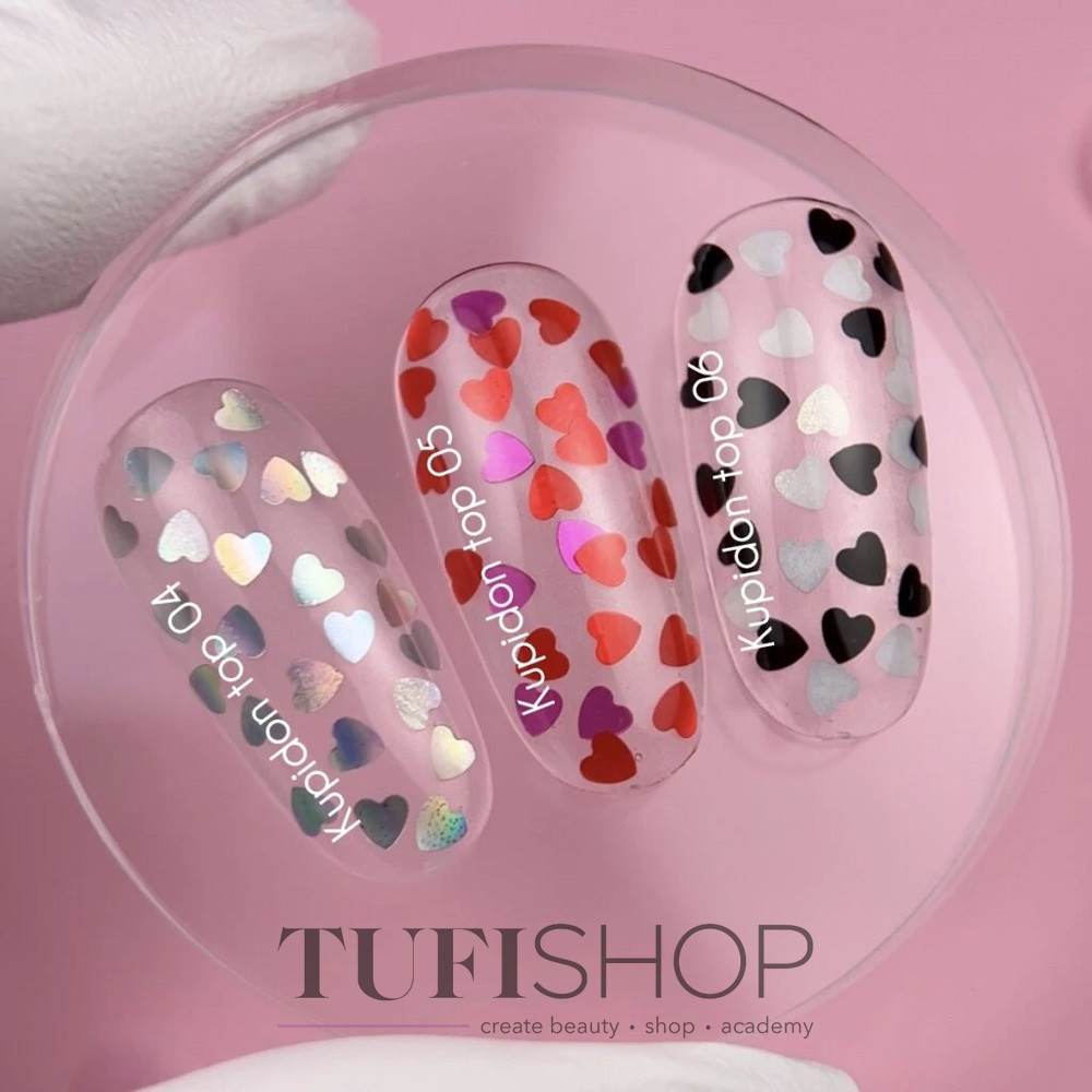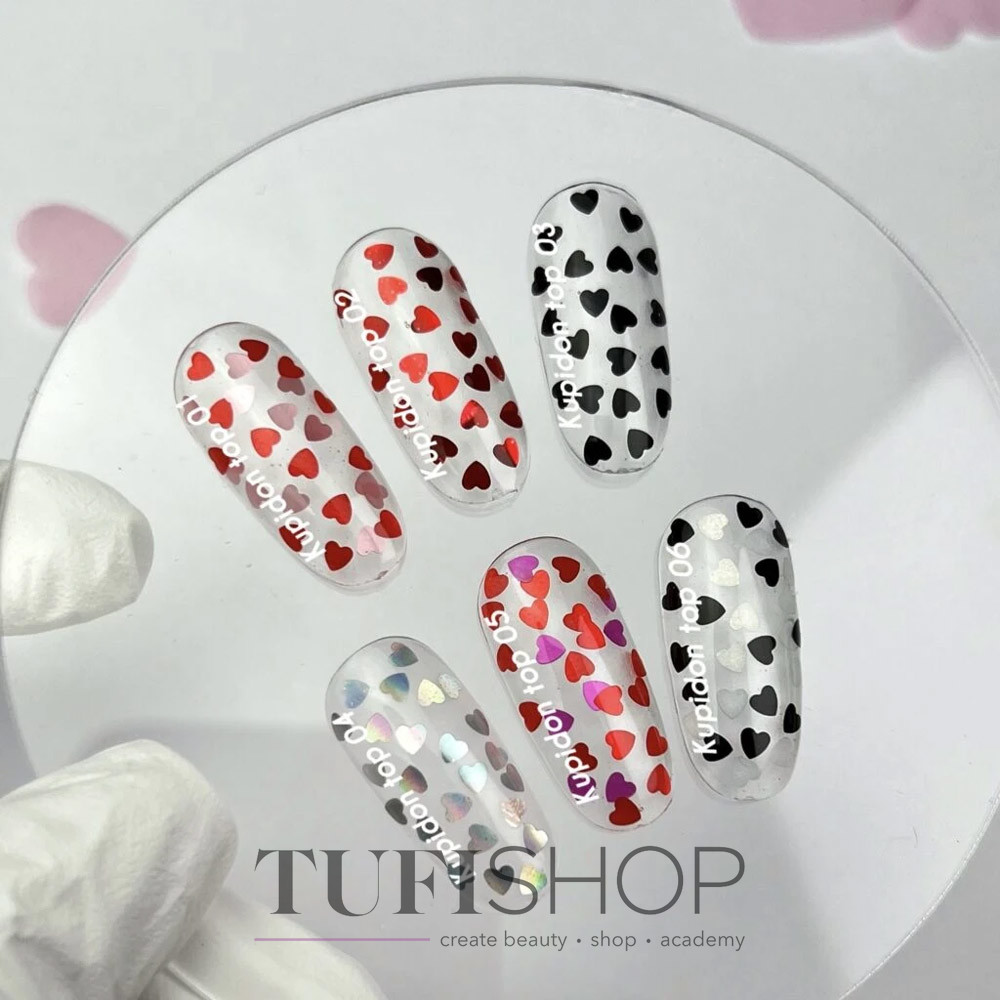 NAILSOFTHEDAY Cupidon Top ist ein zarter Überlack für Gellack mit süßen bunten Herzen. Mit seiner Hilfe können Sie eine festliche romantische Maniküre zum Valentinstag, Geburtstag oder einfach für die Frühlings- und Sommersaison kreieren, um sich selbst und andere mit einem hellen, kreativen Design zu erfreuen.