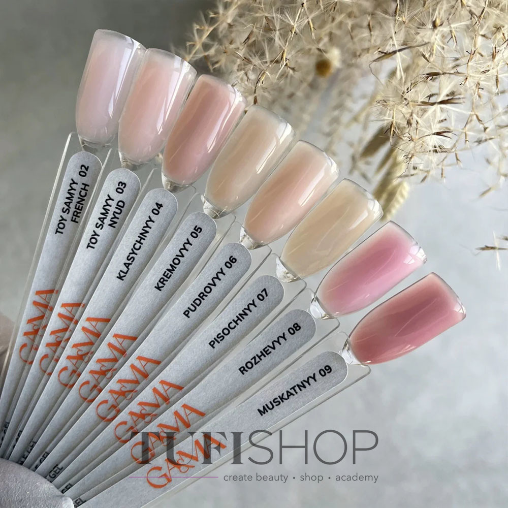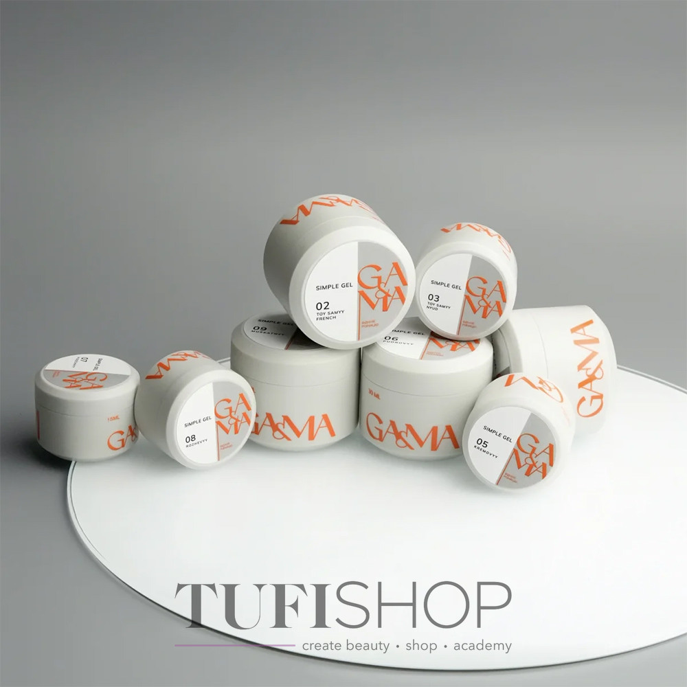 Ga&Ma Simple gel предлагает широкий выбор нюдовых гелей для наращивания, включая розовые, молочные, голубые, коралловые, бежевые оттенки, а также гели с мерцающей текстурой и прозрачный гель. Это идеальный выбор для создания френча и других нейтральных дизайнов.