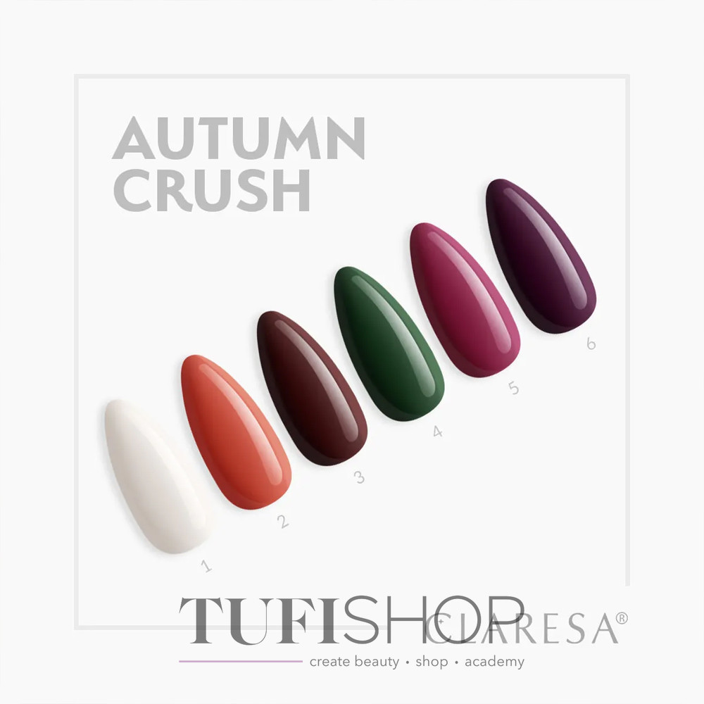 Коллекция Claresa AUTUMN CRUSH – это шесть глубоких, насыщенных цветов, вдохновленных магией прохладных утра, шелестящих листьев и чувственных вечеров. Эти цвета сочетают в себе классику с ноткой экстравагантности – они идеально подходят как для повседневной жизни, так и для особых случаев. Каждый оттенок был создан для женщин, которые любят стиль, элегантность и немного таинственности.