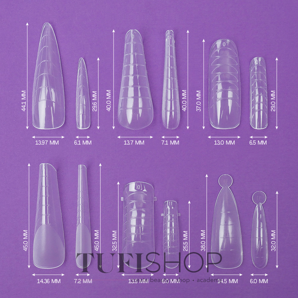 Профессиональный набор многоразовых верхних форм TUFI profi создан для мастеров, которые ценят скорость работы, безупречную архитектуру и премиальный результат. В упаковке представлено 12 видов форм по 24 шт. каждого размера — это позволяет оптимально подобрать форму под особенности ногтевого ложа. В набор входят как классические формы — миндаль, квадрат, балерина, так и более сложные варианты — пайп, стилет, что дает возможность закрыть практически любой запрос клиента. Формы изготовлены из прозрачного, гибкого и прочного пластика, отлично адаптируются к ногтевой пластине и обеспечивают правильную арку, идеальный апекс и натуральную толщину покрытия с минимальным опилом. Встроенная разметка помогает создать ровные, симметричные ногти и прогнозируемый результат на каждом этапе моделирования.