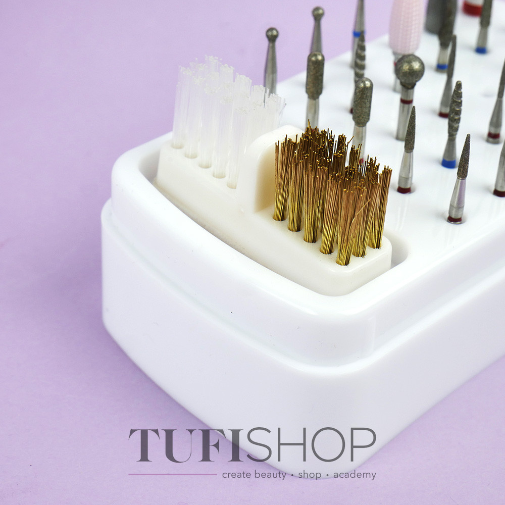Die moderne Maniküreindustrie steht nicht still und überrascht ständig mit neuen Erfindungen, Accessoires sowie Hand- und Nagelpflegeprodukten. Heutzutage nutzen die meisten Handwerker eine Fräsmaschine, da diese den Arbeitsablauf beschleunigt. Zahlreiche Aufsätze und Kappen sind speziell für Fräser gefertigt und ein Ständer sorgt für die sachgerechte und bequeme Aufbewahrung. Der Ständer für Fräser verfügt über 30 Löcher für Aufsätze und eine Bürste zum Reinigen der Fräser, außerdem ist eine Abdeckung im Lieferumfang enthalten, die vor Staub und Verlust von Aufsätzen schützt. Der Ständer sorgt für Ordnung auf Ihrem Schreibtisch und schnellen Zugriff auf alle Anhänge. Wenn Sie Hardware-Verfahren für Maniküre und Pediküre praktizieren, werden Sie die Vorteile einer ordnungsgemäßen, praktischen und kompakten Aufbewahrung der Fräser auf jeden Fall zu schätzen wissen. Die TUFI profi PREMIUM Fräser-Reinigungsbürste dient der Reinigung von Maniküre-Werkzeugen und Fräsern. Die Bürste zum Reinigen von Messern hat zwei Arbeitszonen: die erste mit Metallborsten, die zweite mit harten Borsten. Durch die beiden Seiten können Sie sämtliche Oberflächen des Fräsers problemlos von Staub und Materialrückständen reinigen. Für maximalen Komfort für die Maniküristin ist diese Bürste zum Reinigen von Fräsern auf einer flachen Oberfläche befestigt.